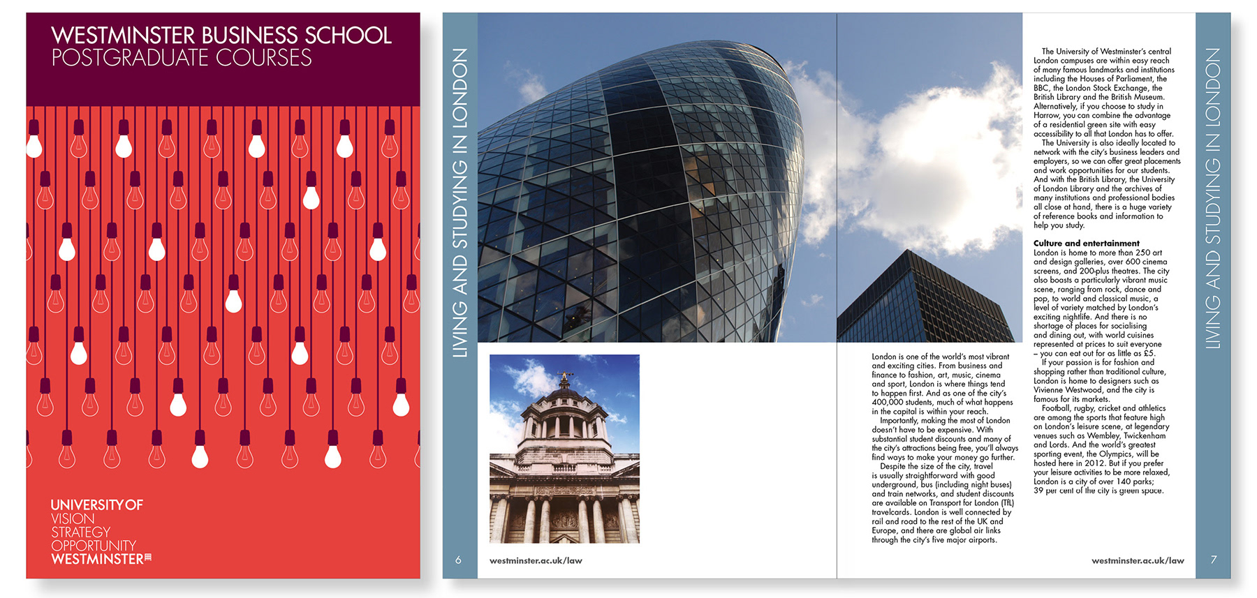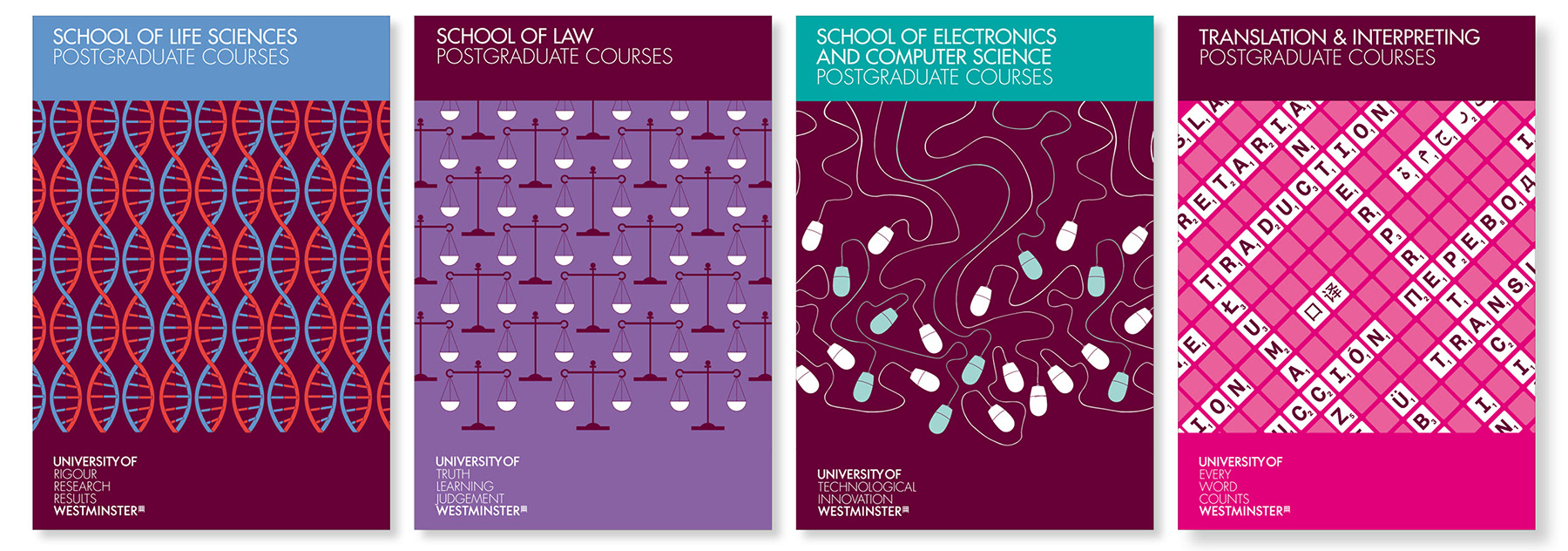 Cover illustrations and design of a range of 12 brochures outlining postgraduate courses at the University of Westminster.